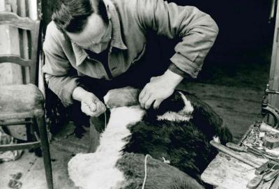 Jean Ros fabriquant un bât : Couture d'une peau de veau pour l'habillage du bât.