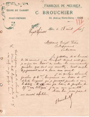 Correspondance avec l'entreprise Orizet frères - Fabrique de meubles C. Brouchier - Usine du Sarret - Puget-Théniers - 1905