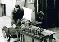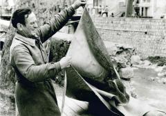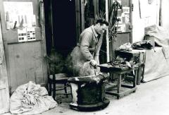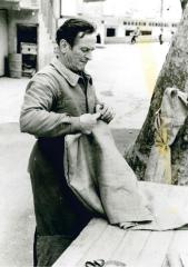 Jean Ros fabriquant un bât : Couture d'une peau de veau pour l'habillage du bât.