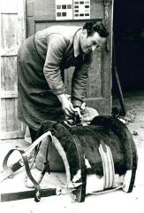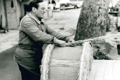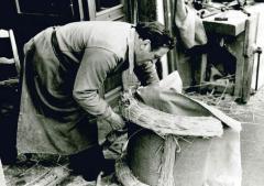 Jean Ros fabriquant un bât : La paille remplissant les coussinets est tassée au moyen d'une planche.