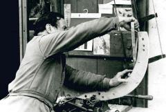 Jean Ros fabriquant un bât : découpe d'un arceau dans une planche de hêtre.