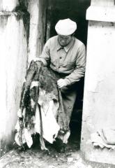 Jean Ros fabriquant un bât : Utilisation d'une peau de veau pour l'habillage du bât