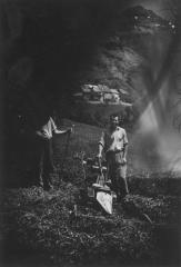 [Homme jouant de l'accordéon et jeune femme dans du foin. Bouchanières ?]