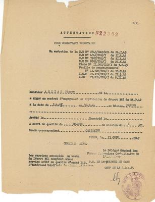 Attestation pour combattant volontaire - 1947 [1)