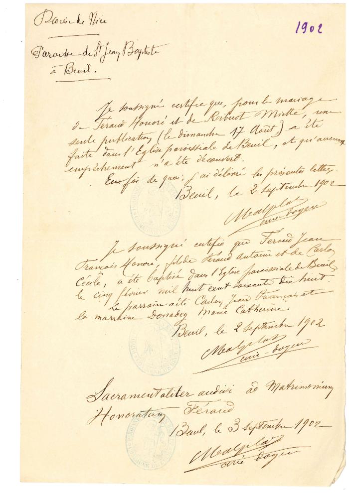 [Certificat de baptême et de publication des bans pour le mariage de Honoré Férand et Miette Ribuot]