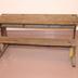 Description : Table banc formant un bloc, dessus incliné avec 3 trous pour le posage des encriers, casier à cahiers et à livres au dessous, banc siège à 3 lames de bois appuyé sur des pieds.