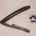 Description : Lame allongée à tranchant très effilé avec un dosseret épais (L : 7,5 cm). La lame se replie dans le manche. L'extrémité de la lame est coudée pour exercer une pression du pouce sur la lame afin de la maintenir en place lorsqu'on se rase. La partie non tranchante de la lame est striée, peut-être, faite-t-elle office de lime ?