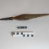 Description : Pièce de bois renflée en son milieu, appointée aux deux extrémités. Une des extrémités forme un décrochement. Elle comprend un embout métallique cranté conique. Il est décoré d'un crénelage à la base puis des stries horizontaux qui encadrent un décor de résille.