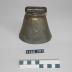 Description : Clochette en bronze moulé à base elliptique (9,3 x 7,3 cm, H : 10 cm), s'amincissant vers le haut (5,4 x 4,3 cm). Battant, qui a disparu. Anse sup. verticale fixe en fer forgé, de forme elliptique (grand axe parallèle à la base) (L : 5,8 cm, Lg : 1,1 cm, encombrement en H : 1,9 cm). Note de la clochette : DO DIESE. Son très juste.