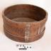 Description : Décalitre en bois déroulé de forme cylindrique ouvert dans sa partie supérieure avec deux renforts circulaires en bois. Le fond est en bois. Liaison avec quatre tiges de fer plat rivetées. Une réparation a été faite au moyen de plaques de zinc rivetées.