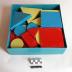 Description : Jeu composé d'un ensemble d'objets de taille, de forme et de couleurs différentes (triangle, carré, rectangle, rond) - couleur fondamentales (rouge, jaune, bleu) - taille grande et petite. Le tout se trouve dans une boîte en plastique bleue. Sur le fond de la boîte dessin de différentes pièces.