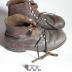 Description : Chaussures montantes en cuir naturel avec une tige à soufflet et un laçage à crochet. Le cuir est durci au talon et à la pointe. Semelles en caoutchouc noir cloués sur le talon et la semelle en cuir. Couture latérale renforcée par deux rivets sur l'intérieur du pied.