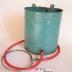 Description : 2001_203_1 : réservoir en tôle émaillée verte tachetée de blanc sur un plan demi-circulaire à bord haut, dos plat