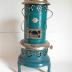 Description : Ce poêle est composé de deux parties qui s'emboîtent l'une dans l'autre. L'extérieur en tôle émaillée bleue se compose de deux parties reliées par une charnière. La partie inférieure sert de base, elle abrite le bloc réservoir brûleur, elle est montée sur trois pieds et sa base est entourée d'une bague chromée. La partie supérieure est cylindrique, son diamètre est plus petit que celui de la base, elle forme la chambre de combustion, sur le devant, une petite fenêtre permet de surveiller la flamme ; sur le sommet chromé, une poignée mobile entourée d'un fil de fer enroulé en spirale permet la préhension de l'appareil et permet ainsi un transport aisé. Le bloc brûleur avec son réservoir intégré, celui-ci a la forme d'une couronne dont le centre sert de conduit d'alimentation en air du brûleur qui est composé de deux bagues concentriques perforées d'une multitude de trous, le brûleur est muni d'une molette de réglage de l'intensité du chauffage.