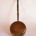 Description : Récipient en métal sur plan circulaire à bords bas galbés, percé de trous, à manche plein et annelé en bois verni.