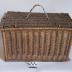 Description : Récipient à base rectangulaire et bords droits en osier tressé. Un couvercle avec poignée ferme le récipient, il pivote sur la longueur par un système d'anneaux en osier. Il est maintenu fermé par des tringles.