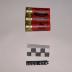 Description : 3 cartouches avec un fût en matière plastique rouge striées, le culot est en laiton avec trois bandes striées. Les cartouches sont neuves.