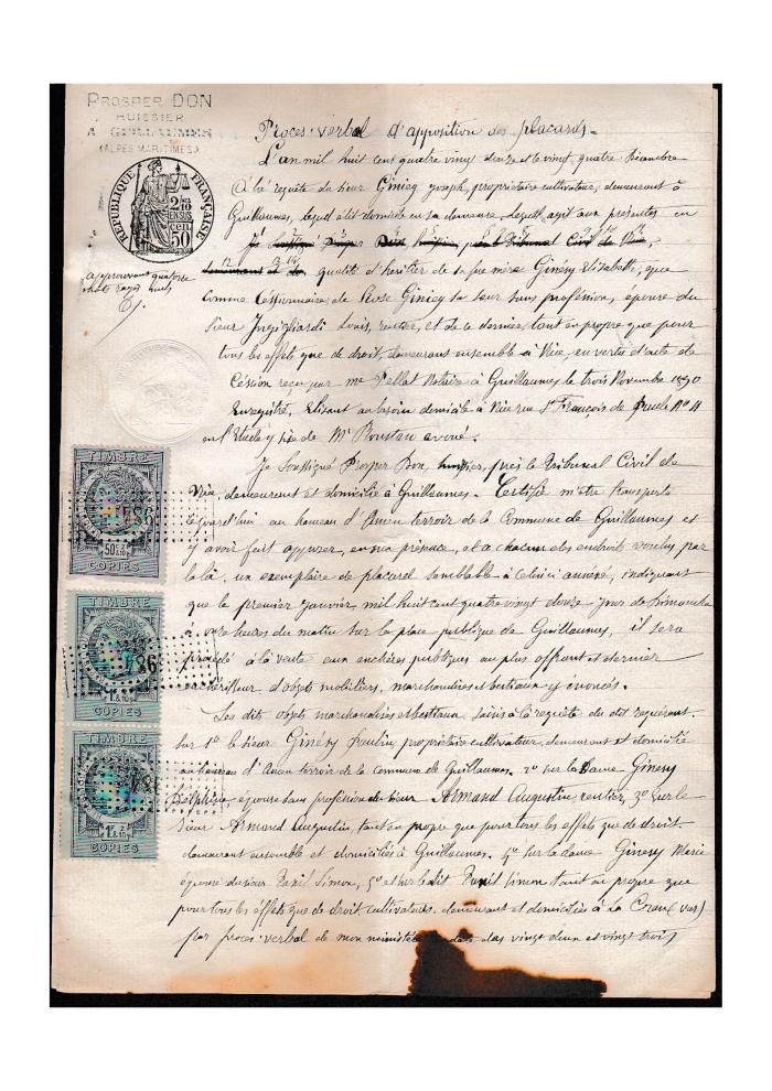 1.Le procès-verbal d'apposition des placards: sur requête de Giniey Joseph, Prosper Don ( huissier à Guillaumes) s'est rendu au hameau d'Amen pour y faire apposer des placards indiquant que le 1er janvier 1892 il sera procédé à des enchères publiques concernant les biens (objets mobiliers, marchandises et bestiaux ) de Ginésy Paulin, Ginésy Delphine , Arnaud Augustin , Ginésy Marie et Taxil Simon.