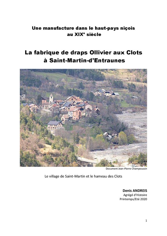 S'appuyant sur des manuscrits  inédits, Denis Andreis retrace l'aventure industrielle méconnue de la Fabrique  Ollivier à Saint-Martin-d'Entraunes depuis sa création par François-Hyacinthe Ollivier en 1820 . Il décrit les grands étapes de la saga familiale des Ollivier, de la prospérité assurée par François Hyacinthe sous la restauration sarde aux belle années du Second Empire avec Césaire jusqu'à l'achat en 1868 de la "maudite " fabrique de Puget-Théniers  qui scellera l'amorce du déclin d'une industrie textile montagnarde maintenant fortement concurrencée par les produits  d'outre-Manche de meilleure qualité.