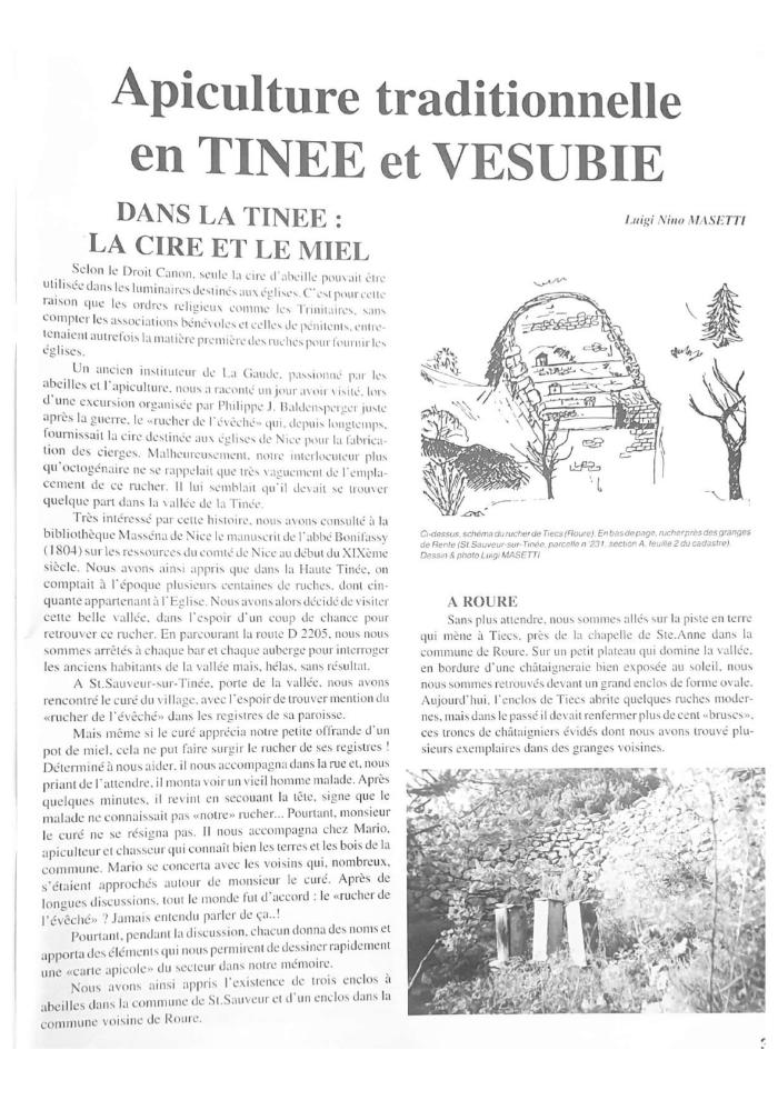 Description : A la recherche du rucher de l'évêché Luigi NIno Masetti nous entraîne d'aborddans la dans la vallée de la Tinée où il va retrouver un certain nombre d'enclos à abeilles à Mollières, à Roure, à St Sauveur sur Tinée et à St Etienne deTinée. Ces enclos renfermaient autrefois des "bruscs"1, troncs de chataîgniers évidés
