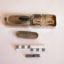 Description : 1/ Boîte rectangulaire aux angles arrondis. Elle comporte deux demi-boîtes de volume égal qui pivote autour d'une charnière dans la largueur. Celles-ci se referment l'une au dessus de l'autre à l'aide d'un bouton qui pousse une tige dans la partie supérieure. La boîte inférieure contient un réservoir amovible surmonté d'un grillage bouché sur une moitié par un demi-couvercle pivotant. Le tout est fermé par un couvercle amovible muni d'un bouton de préhension.