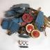 Description : Ensemble de pièces en métal peint en bleu ou en doré. Elles sont percées de trous d'assemblage.