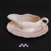 Description : Plat ovale à bord festonné et à filets surmonté d'un récipient ovale, creux avec d'un côté un bec verseur, et de l'autre une anse de préhension.