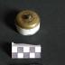 Description : Bloc circulaire en porcelaine blanche contenant le mécanisme de bascule, quatre bornes de raccordement, deux trous de passage pour les vis de fixation. La commande de la bascule est une petite tige circulaire terminée par une sphère en laiton.