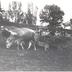 Description : Fenaison à Sausses. Char à bancs tiré par deux boeufs et conduit par Michel Ursule.
